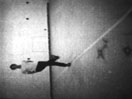 Eine feststehende geneigte Kamera zeigt Bruce Naumann, wie er ca. eine Stunde lang eine anstrengende Übungsfolge wiederholt, mit dem Ziel, sich in seinem Atelier von einem Ende zum anderen zu bewegen. Zu Beginn der Aktion befindet sich Bruce Naumann hinten im Raum und hat die Hände hinter dem Rücken zusammengebunden. Er wirft ein Bein im rechten Winkel nach vorne, dreht seinen Körper um 45° und fällt brutal und geräuschvoll auf dieses Bein; dann hebt er das andere Bein hinten hoch, so daß sich der Körper wie bei einer Waage nach vorne neigt. Dann fängt er wieder von vorne an. Drei Schritte nach rechts, drei Schritte nach links und schließlich nur zwei Schritte nach vorne. Je näher er der Kamera, also dem Betrachter, kommt, um so schwieriger wird es, die Handlung als Ganzes zu erfassen. Die feststehende Kamera definiert die Szene, indem sie aus dem Gesamtbild einen Rahmen herausschneidet. Bruce Naumanns Körper wird dadurch fragmentarisch gezeigt und in einzelen Teile zerlegt. Der Kopf ist oft abgeschnitten oder man sieht nur einen Fuß oder ein Bein. Manchmal verschwindet Bruce Naumann vollkommen aus dem Sichtfeld. Lediglich das Geräusch seiner Schritte läßt darauf schließen, daß er anwesend ist. Dieser losgelöste Umgang mit seinem Körper, seine Zerstückelung und das Wegrücken aus dem Bildfeld wird durch das perzeptorische Schweben und den Eindruck der Schwerelosigkeit, der durch den umgekehrten Raum entsteht, verstärkt. In Slow Angle Walk (Beckett Walk) wird der Betrachter mit einem Gefühl der Entfremdung konfrontiert, wenn er den Künstler einmal in der Bildeinstellung und zum zweiten Mal im Atelier eingeschlossen sieht.
